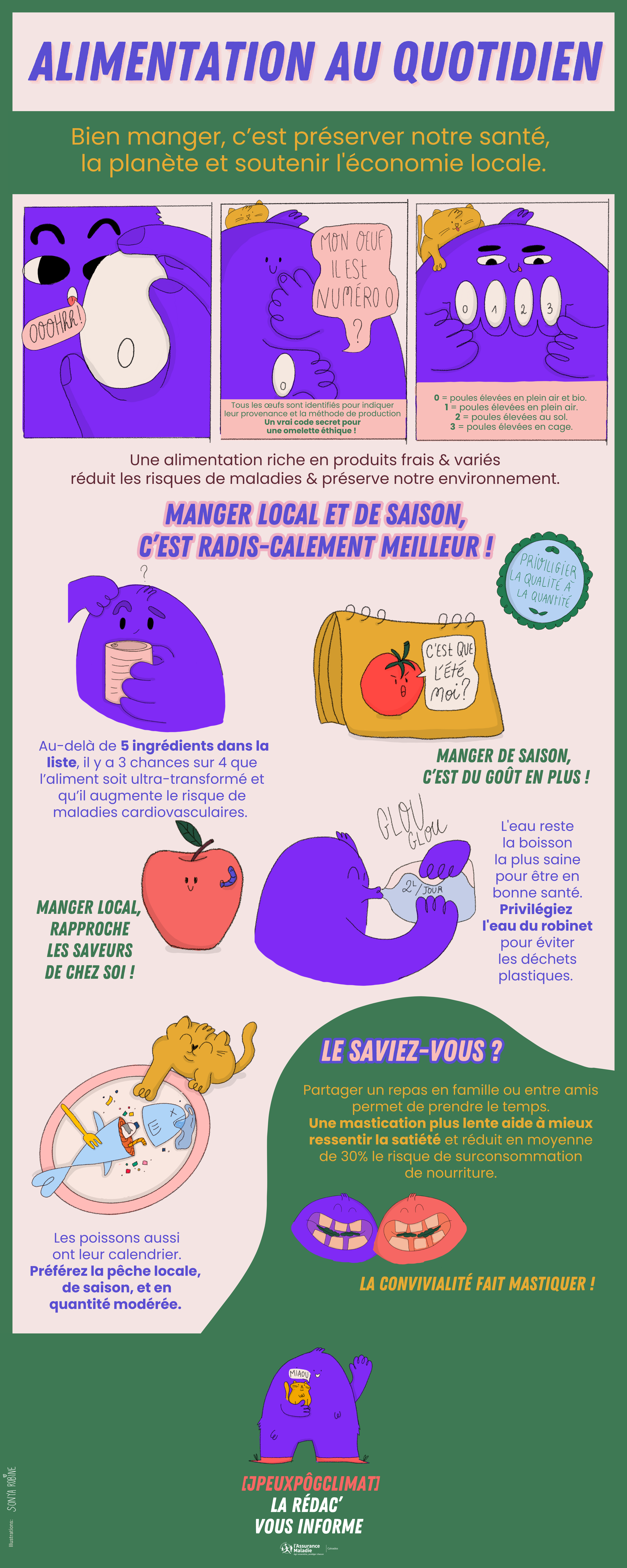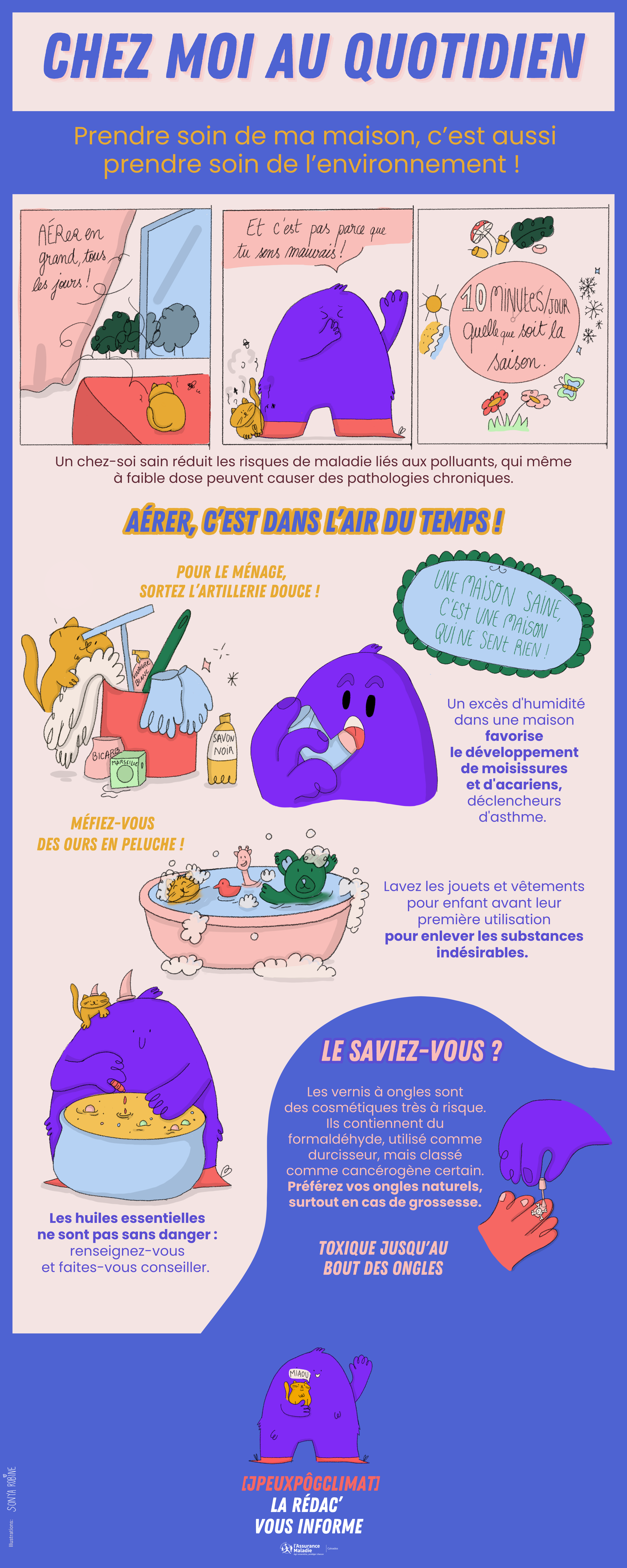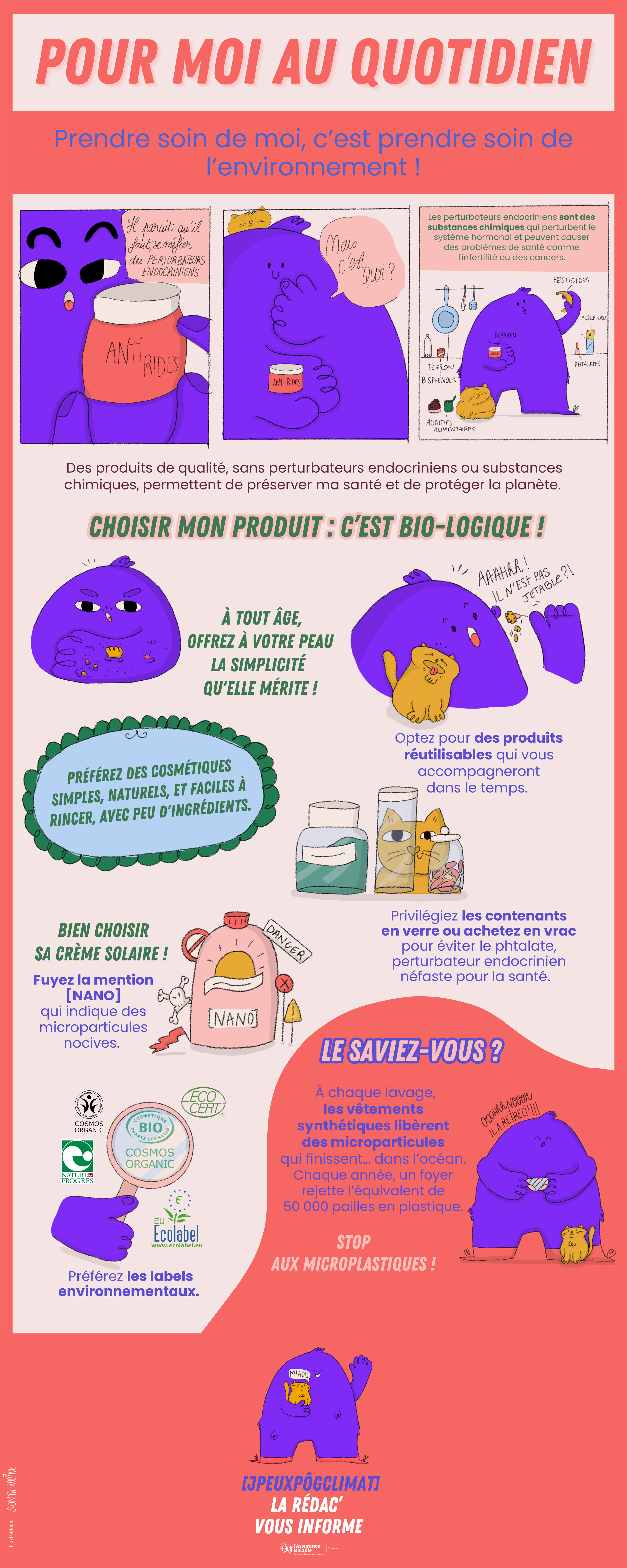 À travers des situations amusantes et avec l’aide de son chat, il sensibilise les lecteurs aux enjeux environnementaux.